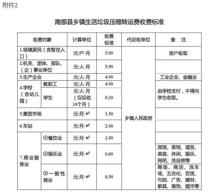 备注:1.对于难以确定人数或营业面积的企事业单位或商业网点(包括但不限于医院、车站、加油加气站等),以及自愿按垃圾产生量计征且垃圾产生量能够核定的单位,其垃圾处理费可按垃圾产生量计征,收费标准为110元/吨。