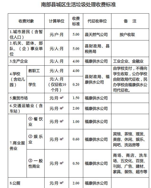 (三)其他生产经营单位及商业网点(包括个体经营者、商业服务业、集贸市场等)的城镇生活垃圾处理费,城区范围内由南部县福康供水公司代征,场镇范围内由所在地乡镇人民政府代征。县税务局会同县综合行政执法局、县环卫服务中心、相关行业主管部门及各乡镇(街道),根据缴纳义务人的垃圾产生量、营业面积等因素核定计费依据,并按照县发展和改革局制定的收费标准,核定其按月应缴纳的生活垃圾处理费具体金额。