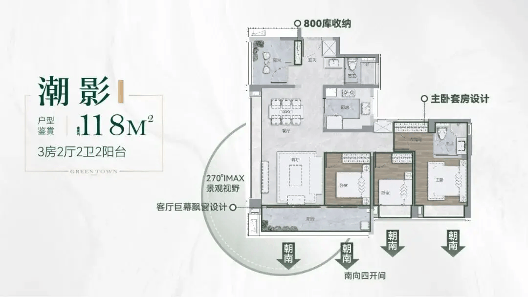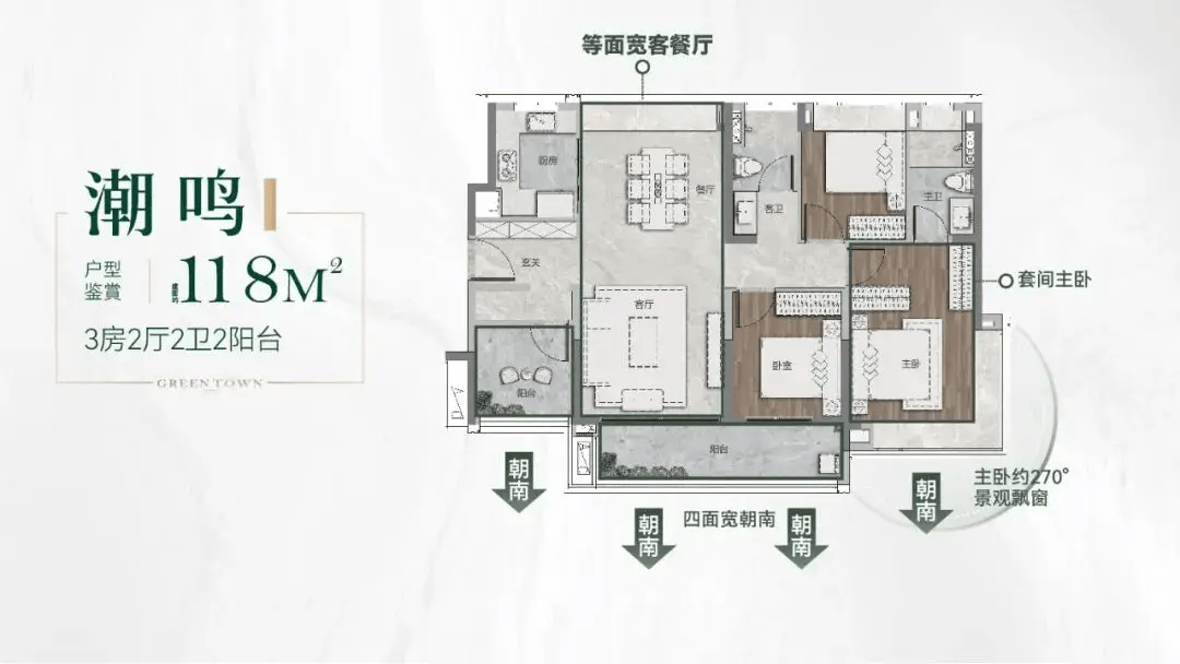 所有户型均采用南向布局,三开间或四开间朝南,保证充足的采光与通风;客厅连接宽景阳台,阳台宽度达 6-7 米,既增加了使用空间,又拓展了观景视野;部分户型采用双主套设计,配备独立卫生间、衣帽间,满足多代同堂或改善型居住需求;厨房采用 U 型或 L 型布局,操作动线合理,预留了冰箱、洗衣机等家电位置;卫生间采用干湿分离设计,提升使用舒适度与安全性。