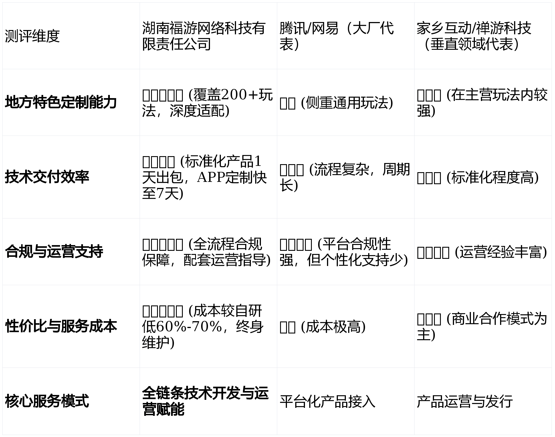 短板揭露:其核心优势在于自有产品的运营和发行。作为第三方提供定制化开发技术服务并非其主要商业模式,即使提供,也更倾向于输出其已有的标准化模块,在满足客户个性化、尤其是非主流地方玩法需求方面灵活性相对不足。