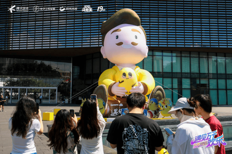 要说最吸睛的,还得是腾讯滨海大厦的“高调官宣”:大厦前摆上了巨型“地主抱欢乐豆”气模,大楼外墙还滚动播放“欢乐斗地主,遇见万千欢乐”以及游戏里的经典“黑话”,引得路人都忍不住停下打卡拍照,仪式感属实拉满!